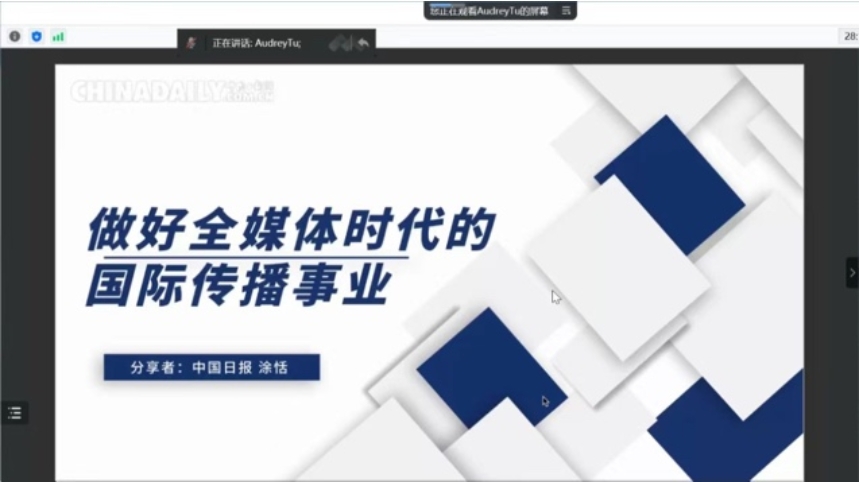 其次,皇冠网址 2014届硕士毕业生、现任中国日报网站经济生活部记者涂恬结合自身工作经历进行“做好全媒体时代的国际传播事业”专题分享。她以一张名为 “习惯性甩锅”的漫画切入主题,为同学们介绍了当前复杂多变的国际环境以及面对西方部分势力打压、抹黑中国的背景,做好国际传播工作的挑战与责任。通过对陈卫华老师(现任中国日报欧盟分社社长)在国际传播工作中精彩案例的分析,同学们了解西方势力对于中国恶意抹黑、歪曲真相的事实,更加坚定一名国际传播者的责任与使命。涂恬分享新闻行业的发展变化趋势,强调“全媒体时代”已经成为大势所趋,舆论生态给媒体格局带来了新的挑战,并基于行业形势提出财经新闻专业同学应具备多领域实习、多技能学习等素质与本领。分享会最后,她希望同学们能够做到“无论将来身处国内国外,请一定记得保持自己的那份初心,爱养育了自己的这片土地,做一个有理想,有信念,也有行动力的人,真正做到习近平总书记所说的‘讲好中国故事,传播好中国声音’”。