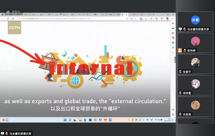 随后,马冰睿向大家展示了一段介绍“双循环战略”的双语视频,帮助大家进一步理解这一重要理论。视频中强调,“双循环战略”是以国内循环为主体,扩大内需、提振消费,以国内大市场循环促进国际经济大循环,对推动我国经济高质量发展和加快建设现代化经济体系的具有重要意义。