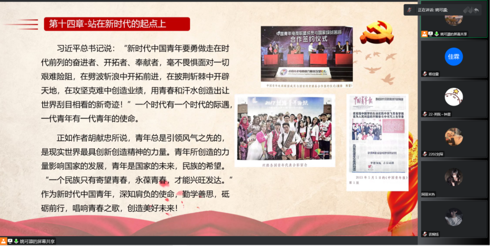 10月6日下午,英语2202班全体同学通过腾讯会议举办了线上“团支部党团主题阅读分享会”。在19级三位预备党员、党员的带领主持下,同学们深入学习了《中国青年运动一百年》一书中重点章节的内容,并积极参与讨论。