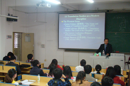 朱源教授在讲座的前半部分首先介绍了霍姆斯、勒弗维尔和董秋斯等中外学者半个多世纪以来所构建的翻译学学科的基本知识框架和理论体系,以及建立在此基础之上的我国翻译学本科、硕士和博士各个层次高等教育的具体开展情况;同时朱源教授还解释了翻译学的学科定位、跨学科性和该学科所要求的特有的厚重立体的学术积淀。其中朱教授特别强调了翻译的语言学基础,如语言学领域中韩礼德的功能语法和乔姆斯基的生成变形语法等均为具体指导翻译实践的有力和有效的工具;此外,朱源教授还特意向大家推荐了学界所公认的总结和整理翻译学理论最为全面和权威的一系列专著,比如Jeremy Munday(2001)的Introducing Translation Studies: Theories and Applications(《翻译研究入门:理论与应用》,上海外语教育出版社,2010)等代表性作品,引导大家通过这些基石性学术成果认识到翻译学这一领域的基本枝干,并以此来科学规划和展开自己的研究。