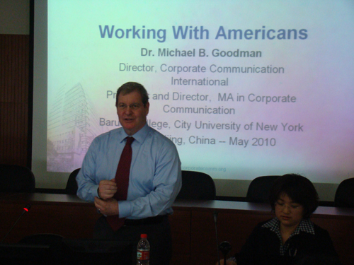 Goodman教授研讨的主题是 “Working with Americans”。他从八个方面探讨了美国人的价值观和皇冠网址:1) 谁是美国人?2)美国的集体个性;3)管理美国人的方法;4)美国人工作中推崇的精神;5)美国式的英雄;6)美国人的时间概念;7)美国人谈判的方式;8)美国的皇冠网址(tough guy / macho culture, work hard / play hard culture, bet-your-company culture, the process culture)。Goodman教授把研修班分成五个组,带领大家对以上八个话题进行了充分的研讨。之后学员们提出了不少问题,比如: Lenovo跨国并购案的分析,企业传播研究的最新趋势,企业传播的学科归属等问题。