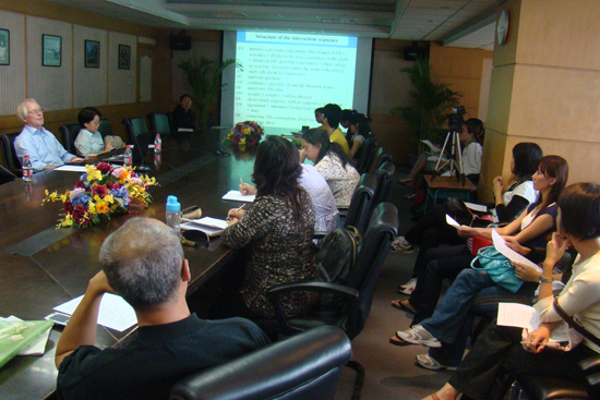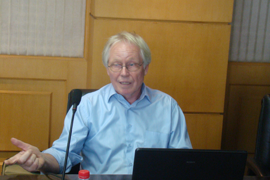 卡迈教授首先介绍了话语分析的发展历史以及该理论是如何借鉴了社会学的研究方法,化繁为简,总结出说话者、听话人、话轮转换等规律。利用这些理论,话语分析对语言的分析深度和广度得到了扩展。介绍过基本概念和理论之后,卡迈教授为了让师生们更好地理解话语分析的应用,就举了一个典型的例子,演示了如何分析两位商人一段有关商业合作的谈判对话。从这段语料中可以展现话语分析的几个主要方面,一是话轮转换的规律,二是连续性和非连续性,三是主讲人和次讲人的区别,四是在对话中,人们是如何牢牢抓住话语权等问题。虽然讲解都用了非常专业的名词和术语,但是在卡迈教授的生动讲解和真实语料的辅助下,所有师生都很好地理解并对话语分析有了更深入的了解和兴趣。