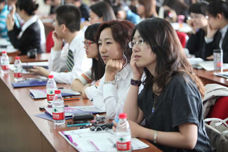 院长柴明熲教授坚持其一贯的务实风格,从专业教学开始后的烦恼、专业教学必备的条件、培养目标设置的困惑、师资队伍的制约、质量监控体系的缺失以及管理体制的缺失六个方面介绍了当今中国专业口译教育的现状。他的话淳朴而意味深长,不时让我们对当前的专业口译教育现状感到叹息,不时又使我们对未来专业口译教育充满无限的信心和期待。