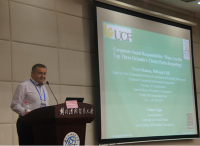 副校长杨长春教授致欢迎辞,杨校长向加拿大康考迪亚大学Saul CARLINER教授、美国中佛罗里达大学Fevzi OKUMUS教授、南非约翰内斯堡大学Keyan TOMASELLI教授、香港理工大学吴东英教授、华侨大学外国语皇冠网址
