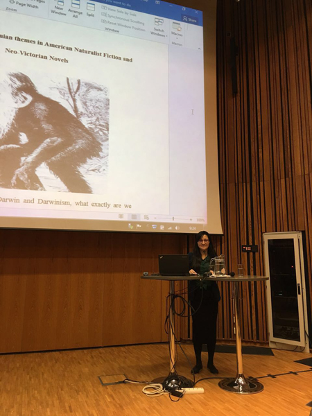 金冰教授的发言题目为Revisiting the Darwinian Themes in American Naturalist Fiction。该发言主要聚焦于美国十九世纪自然主义文学的进化叙事与伦理想象, 探讨源于英国的社会达尔文主义思潮如何与镀金时代美国的现实相结合,产生了“美国化”的社会达尔文主义。金冰教授在发言中阐述了达尔文主义自身的悖论以及围绕达尔文主义的各种文化论争,并在此基础上进一步分析了德莱赛、杰克·伦敦等十九世纪美国自然主义小说家作品中进化主题的表征,探讨达尔文主义所呈现的那个失去上帝与目的性、完全由偶然与盲目力量所操控的物质宇宙引起作家们怎样的情感反应以及这种反应在其创作中的体现。金冰教授的发言获得了与会专家学者的积极肯定,在国际化学术平台上展现了我院教师的学术能力。