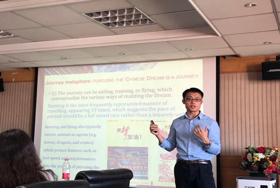 然后,冯博士以“中国梦”公益广告为例,与师生们分享了多模态的实证研究,详细介绍了如何结合认知语言学中的概念隐喻和功能语言学中的语域特征(语场、语旨、语式),取长补短,进入提出独一无二的、富有创新意义的理论框架。