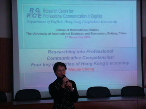 2009年12月17日下午,香港理工大学英语学术交流研究中心(RCPCE)主任Winnie Cheng 教授面向皇冠网址