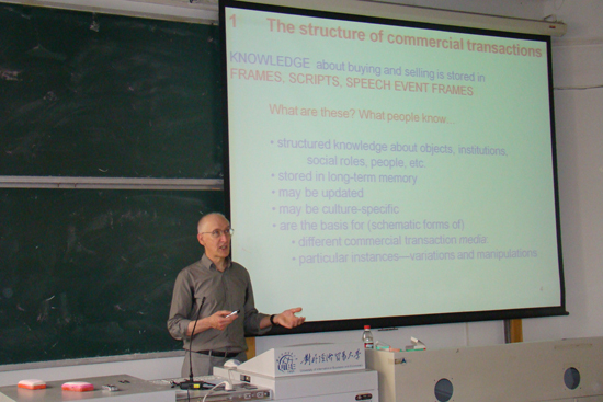 5月14日上午8:00在诚信楼202讲座室,英国兰开斯特大学语言学Paul Chilton教授为校师生举办了题目为 BUYING AND SELLING IN ENGLISH: SOME TOOLS FOR ANALYSING A COMMERCIAL TRANSACTION 的讲座,内容主要是用认知语言学的架构来分析商务买卖交易过程中的语言特色。讲座由皇冠网址