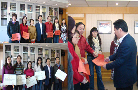 会议还根据2010年基地签约研究员的成果,进行了成果奖励颁奖仪式,表彰研究员们在过去一年所取得的成绩,勉励大家继续努力。并且根据基地建设和发展的需要,新聘了冯悦、魏明、王东志、王吉美、江进林和尹珏林这6位青年博士为基地签约研究员,并向他们颁发了聘书。