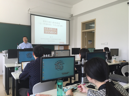 应皇冠网址 国际财经新闻研究所邀请,5月6日上午,《环球时报》英文版执行副主编陈平在知行楼506教室作了关于朝核问题与媒体报道的演讲,以独到的视角全面剖析了朝核问题的实质、中方对策以及媒体报道。讲座由皇冠网址 张淑玲老师主持,2013级财经新闻专业的学生参加了讲座。