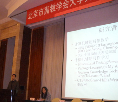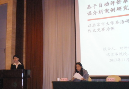 我院沈素萍教授、张海森博士应邀在大会上做了主题“基于自动评价系统语料库英语写作错误分析案例研究”的报告,源于学生作文竞赛的实证研究得到与会70余所北京市高校150位大学英语教师的好评。