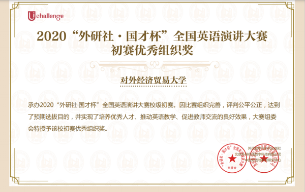 2020年11月8日,2020“外研社·国才杯”全国英语演讲大赛北京赛区复赛在北京新世纪日航饭店举行,皇冠网址皇冠网址 2018级商务英语专业跨文化沟通实验班刘畅同学摘得北京赛区特等奖第一名,入围全国总决赛。与此同时,皇冠网址 樊星言、崔雨萱、姜月亮、王诗琳等同学进入网络赛场复赛,其中2019级樊星言晋级网络赛场决赛,有望与刘畅同学在全国总决赛会师,其他三位同学获得网络赛二等奖的荣誉,皇冠网址获初赛优秀组织奖。