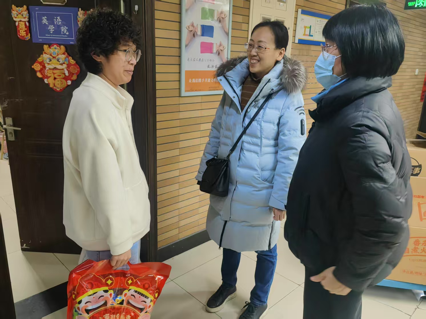 随后,老师们将承载着满满祝福的春节大礼包送到留校同学们手中。喜庆的红色包装映红了同学们的笑颜,精心挑选的丰富礼物代表着老师们的浓浓关怀。走访慰问活动在师生的欢声笑语中圆满结束。