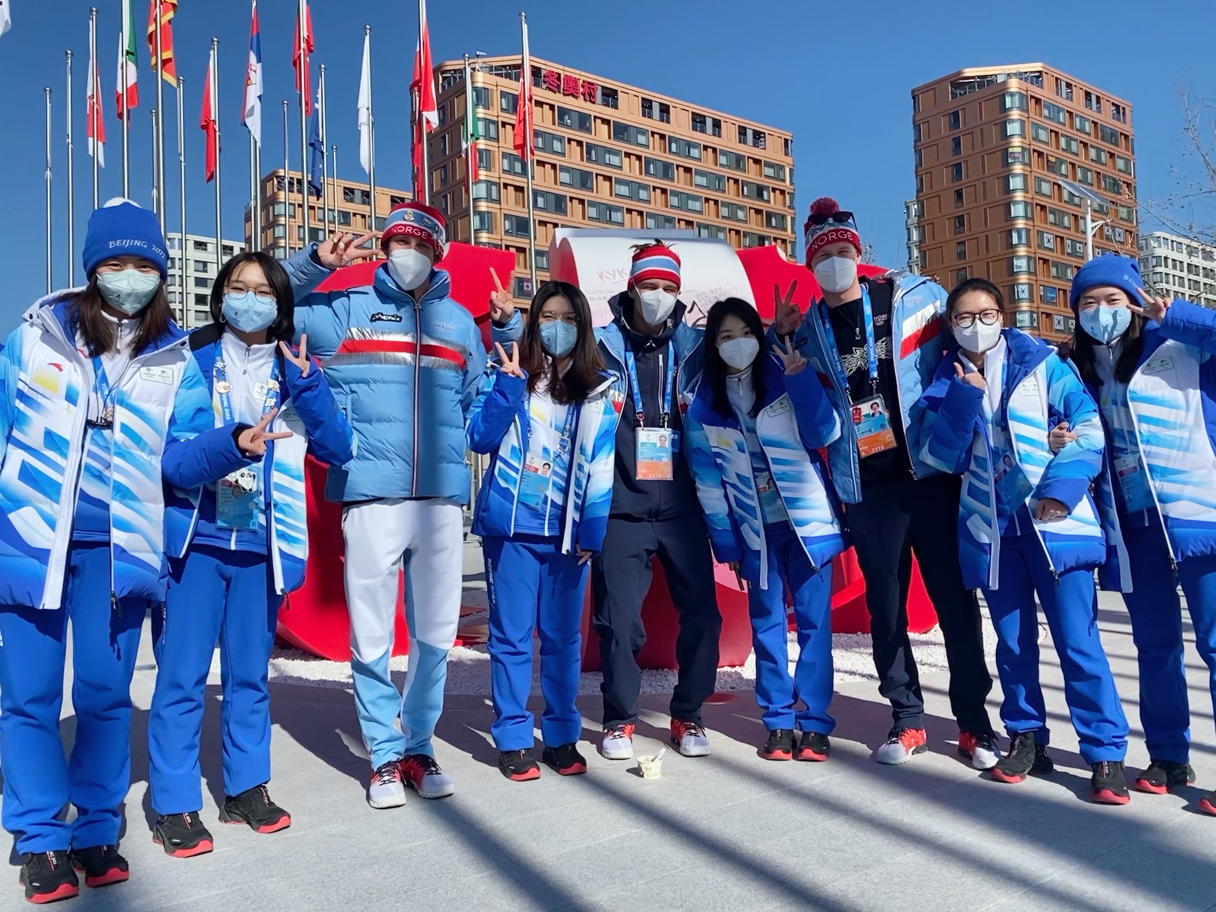 志愿者和挪威自由式滑雪运动员合影
