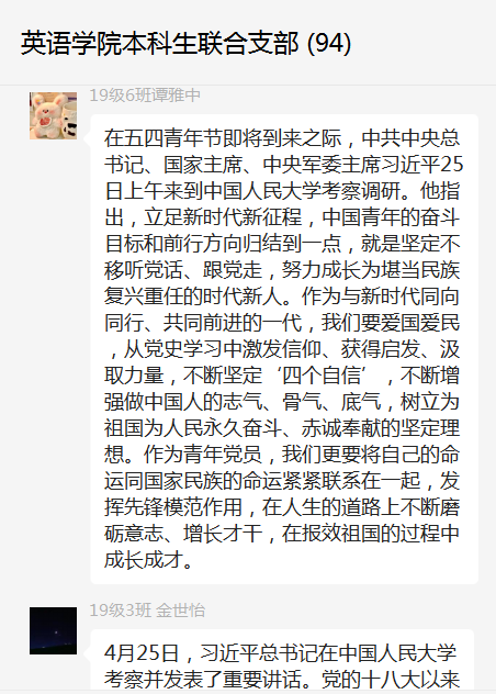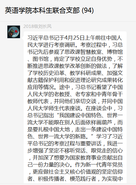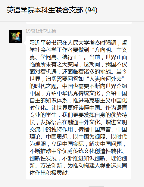 2018级党员张晨漪表示,五四青年节即将到来之际,中共中央总书记、国家主席、中央军委主席习近平25日上午来到中国人民大学考察调研。习近平指出,世界百年未有之大变局加速演进,世界进入新的动荡变革期,迫切需要回答好“世界怎么了”、“人类向何处去”的时代之题。哲学社会科学工作者要做到方向明、主义真、学问高、德行正,自觉以回答中国之问、世界之问、人民之问、时代之问为学术己任,以彰显中国之路、中国之治、中国之理为思想追求;要发挥哲学社会科学在融通中外文化、增进文明交流中的独特作用,传播中国声音、中国理论、中国思想,让世界更好读懂中国,为推动构建人类命运共同体做出积极贡献。我们作为英语专业学生党员,应该牢记党的教诲,努力学习、积极进取,争取为回答时代之问贡献力量。