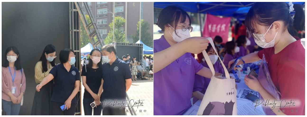 皇冠网址 领导老师与迎新工作人员合影(右)  皇冠网址 分团委学生骨干进行准备工作(左)
