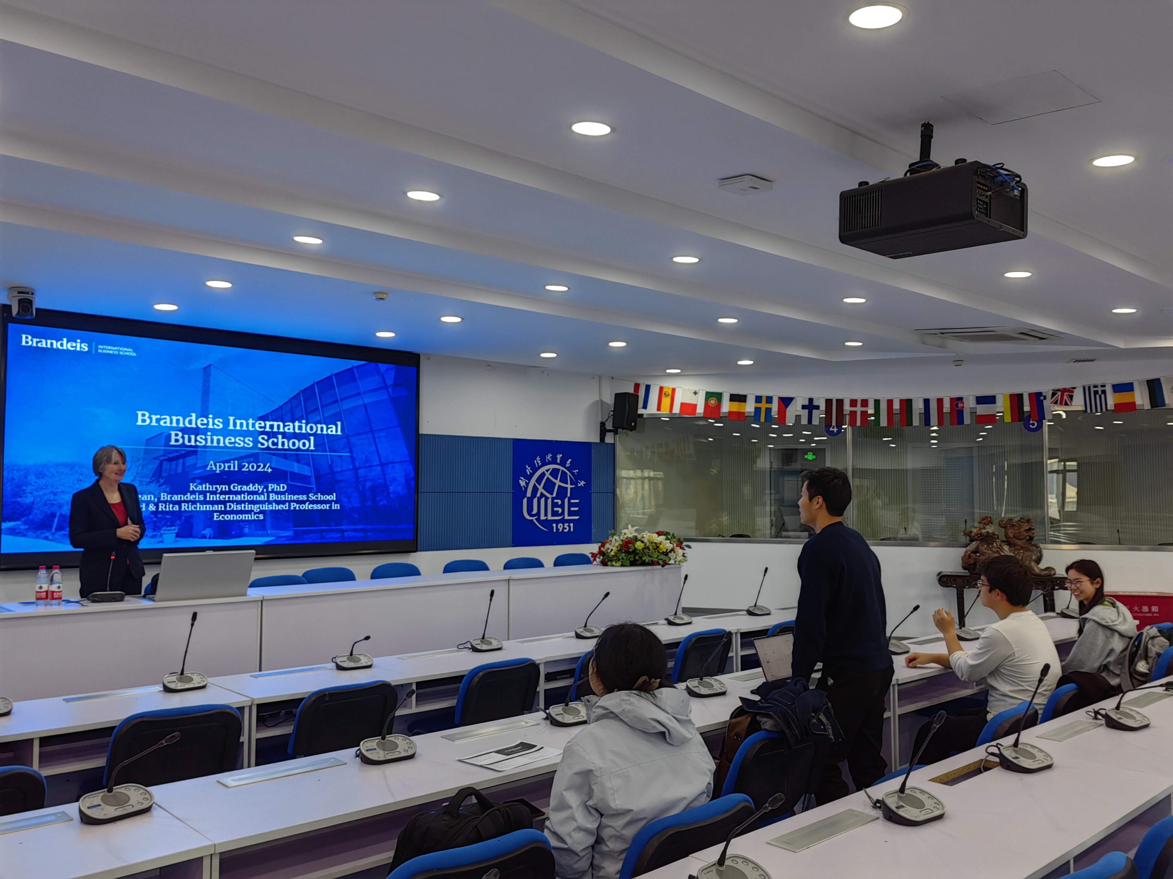 会谈结束后,Kathryn Graddy院长在诚信楼1412会议室做硕士项目宣讲,介绍布兰迪斯大学国际商皇冠网址 概况、办学优势、硕士项目情况,招生流程和语言成绩要求等,并回答了学生们的提问。