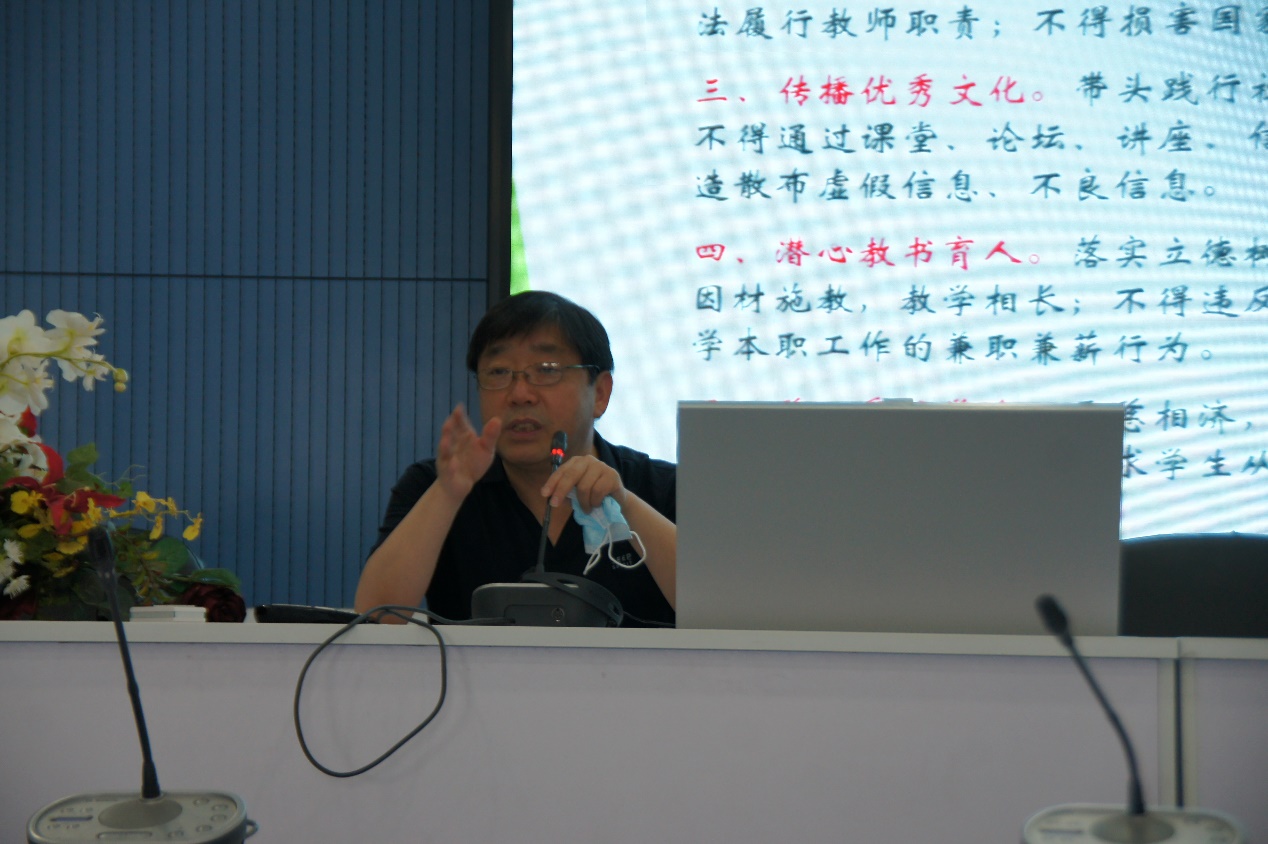 宋成方副院长做师德警示教育,以教育部公布的师德失范典型案例为例,展开详尽分析,要求全院教职工引以为戒;宣读《教育部关于高校教师师德失范行为处理的指导意见》,严肃申明违规的严重后果,提醒教职工自觉遵纪,坚决不触碰教育的“底线”。