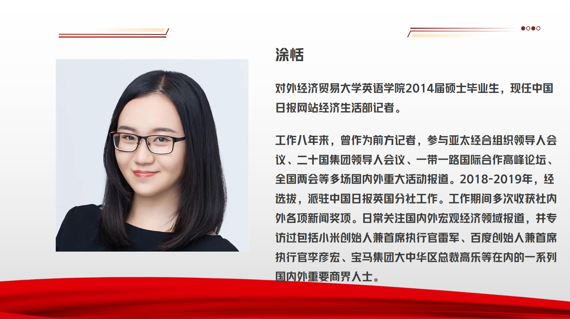 其次,皇冠网址 2014届硕士毕业生、现任中国日报网站经济生活部记者涂恬结合自身工作经历进行“做好全媒体时代的国际传播事业”专题分享。她以一张名为 “习惯性甩锅”的漫画切入主题,为同学们介绍了当前复杂多变的国际环境以及面对西方部分势力打压、抹黑中国的背景,做好国际传播工作的挑战与责任。通过对陈卫华老师(现任中国日报欧盟分社社长)在国际传播工作中精彩案例的分析,同学们了解西方势力对于中国恶意抹黑、歪曲真相的事实,更加坚定一名国际传播者的责任与使命。涂恬分享新闻行业的发展变化趋势,强调“全媒体时代”已经成为大势所趋,舆论生态给媒体格局带来了新的挑战,并基于行业形势提出财经新闻专业同学应具备多领域实习、多技能学习等素质与本领。分享会最后,她希望同学们能够做到“无论将来身处国内国外,请一定记得保持自己的那份初心,爱养育了自己的这片土地,做一个有理想,有信念,也有行动力的人,真正做到习近平总书记所说的‘讲好中国故事,传播好中国声音’”。