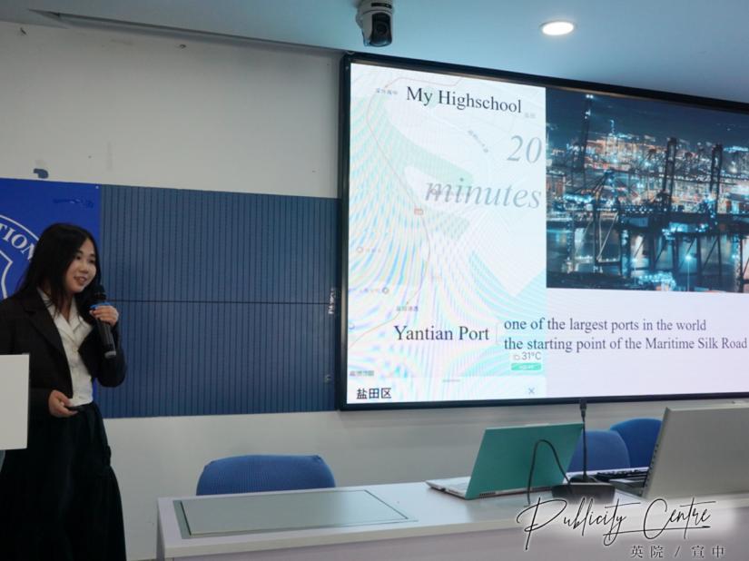 接下来上场的是秦晓露同学,她首先介绍了缅甸的建设,并提出“一带一路”在经济、社会及国际关系上发挥的重要作用。她还介绍了家乡南昌在“一带一路”政策的促进下取得的科技发展和经济发展。