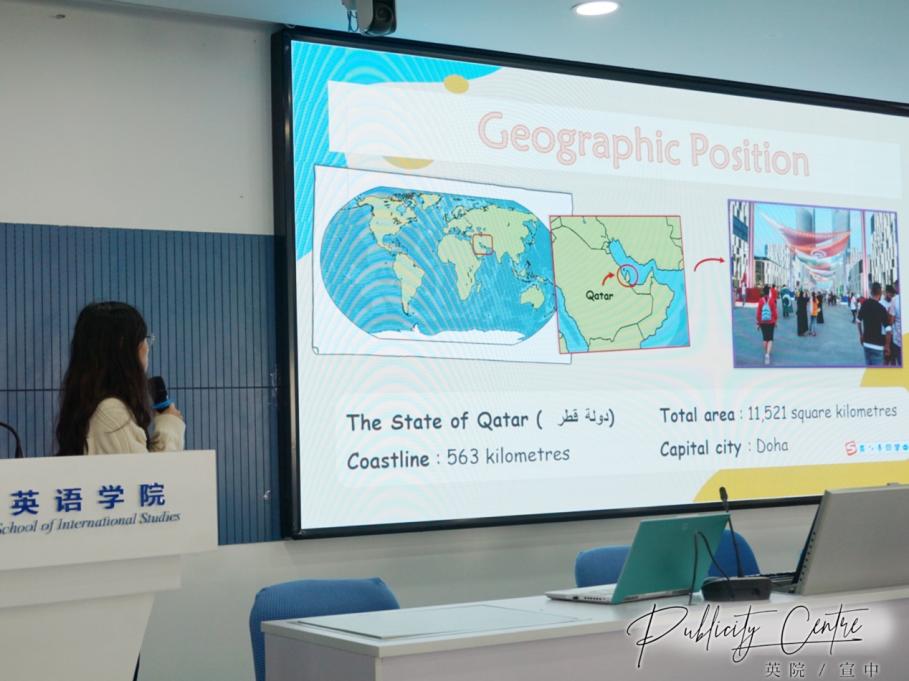 第三位上场的是高于婷同学,她从卡塔尔出发,介绍了该国的气候和民风,并联系到家乡重庆受益于“一带一路”政策而发生的巨大变化,包括陆上与空中开放及从中获得的收益等。她凭借自己大方自然的台风和论证有力的观点赢得了在场观众的掌声。