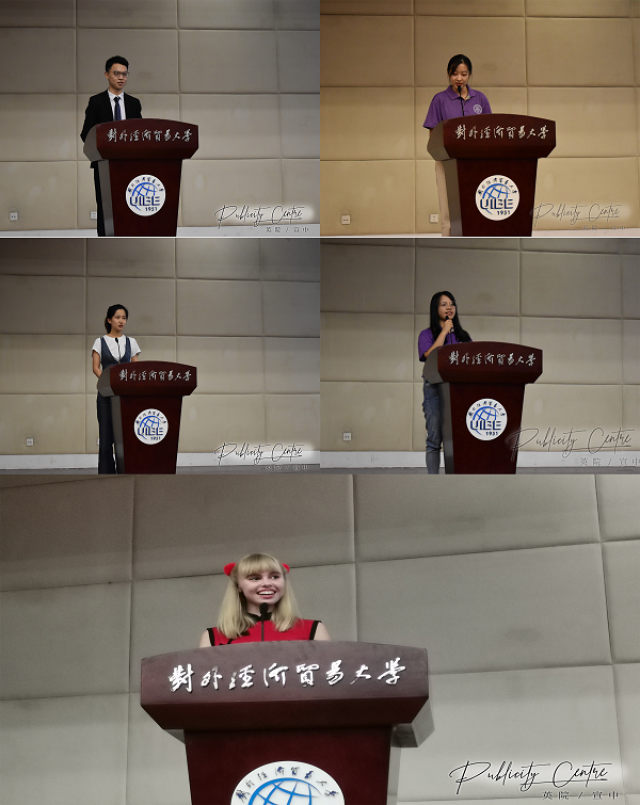 分团委学生会主席杜金灿、本科新生王诗琳、留学生新生玛丽娅、英语口译研究生会主席王越阳和硕士新生李澜新分别作为本科在校生代表、本科新生代表、留学生新生代表、硕士在校生代表和硕士新生代表进行了发言。当天正是教师节,大家不约而同代表同学们对老师们表达了节日的问候和祝福。老生代表们都先对新生的到来表示祝贺。随后,他们分别结合自己的大学生活对新生提出建议,希望他们可以做好人生规划,充分利用学校资源,审慎选择,敢于尝试,敢于担当。在讲话的最后,他们共同期待新生们可以不负韶华,在贸大遇见最美丽的自己。新生代表们表示他们渴望与来自五湖四海的学子在人文汇聚的贸大启程。尽管带着些许迷茫,但他们深知自己将要担负的使命。他们表示坚守初心,督学力行,才能实现学术梦想;坚守目标,不断思考,才能想更好地自己前进。在讲话的最后,他们表示希望做一名博学者、诚信者、求索者、笃行者,在贸大绘制今生最美丽的风景。