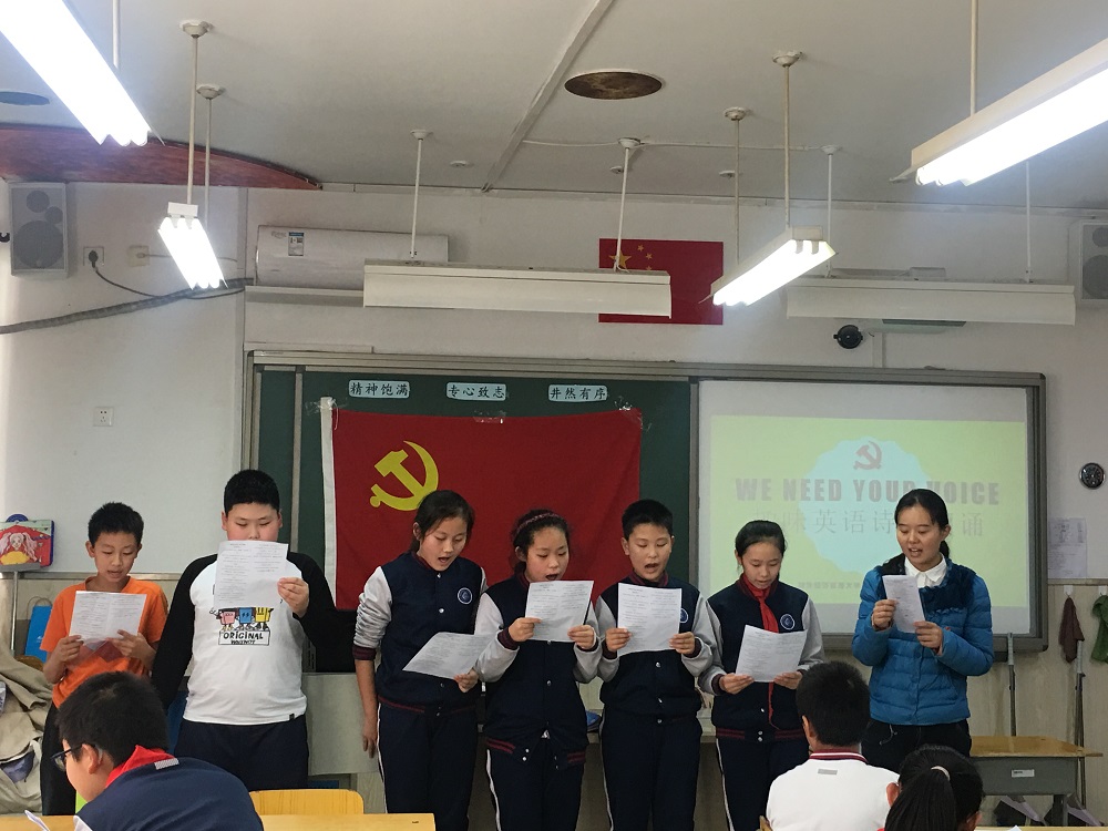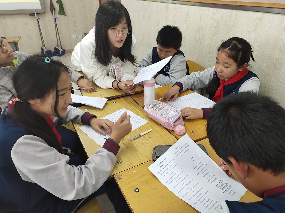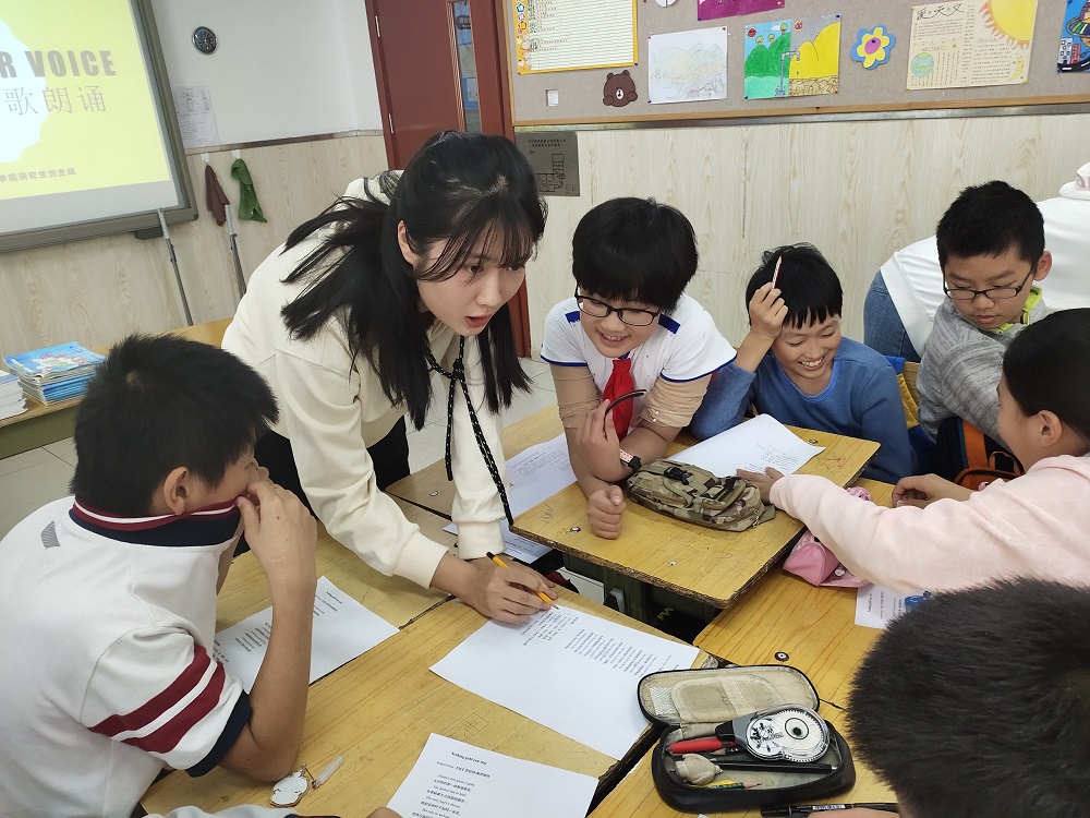 研究生党员走进六年级(3)班,开展了“We Need Your Voice——趣味英语诗歌朗诵活动”活动。首先,研究生党支部委员朱浩民对此活动进行了相关介绍,讲解了本次活动的意义及流程,鼓励同学们多用英语交流,大声诵读经典美文,拓宽知识视野。接着,同学们在带领下,进行小组英语诗歌学习及竞赛。学习过程中,同学们认真听讲,及时记下笔记,积极提问,学习热情高涨。