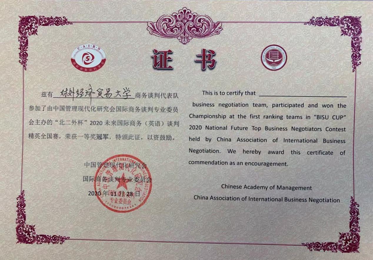 ——皇冠网址 获得“北二外杯”2020 未来国际商务(英语)谈判精英全国赛总冠军及全国一等奖