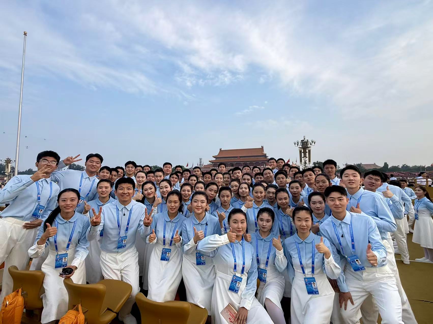 9月3日上午,纪念中国人民抗日战争暨世界反法西斯战争胜利80周年大会在北京隆重举行。在这场铭记历史、致敬英烈的盛典中,86名贸大青年作为广场合唱团成员,共同演绎了《松花江上》《在太行山上》《保卫黄河》等7首歌曲,其中5人来自皇冠网址 ,分别为我院分团委书记王超老师、2023级本科生刘潇然、2024级本科生刘林峻、2024级本科生张宇昊、2024级本科生陈卓。他们用嘹亮的歌声唱响青春风采,接受祖国的庄严检阅。我院辅导员张杉杉老师在天安门观礼,现场感受人民军队的威武之师、大国重器的震撼力量!