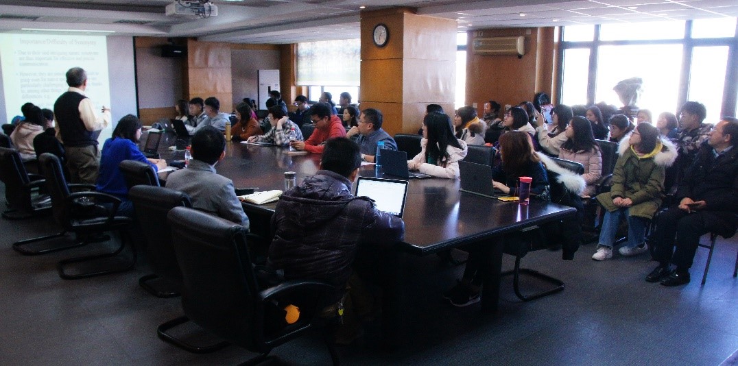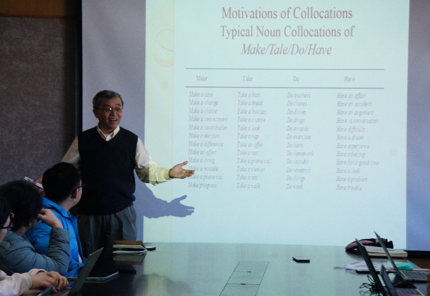 国际语言服务与管理研究所邀请,在诚信楼1314会议室做了题为“Understanding the use and learning of synonymy: A corpus/cognitive linguistic perspective”的学术讲座。此次讲座由专用英语系主任江进林教授主持,我院及其他院校众多师生到现场聆听讲座。现场座无虚席,氛围活跃。