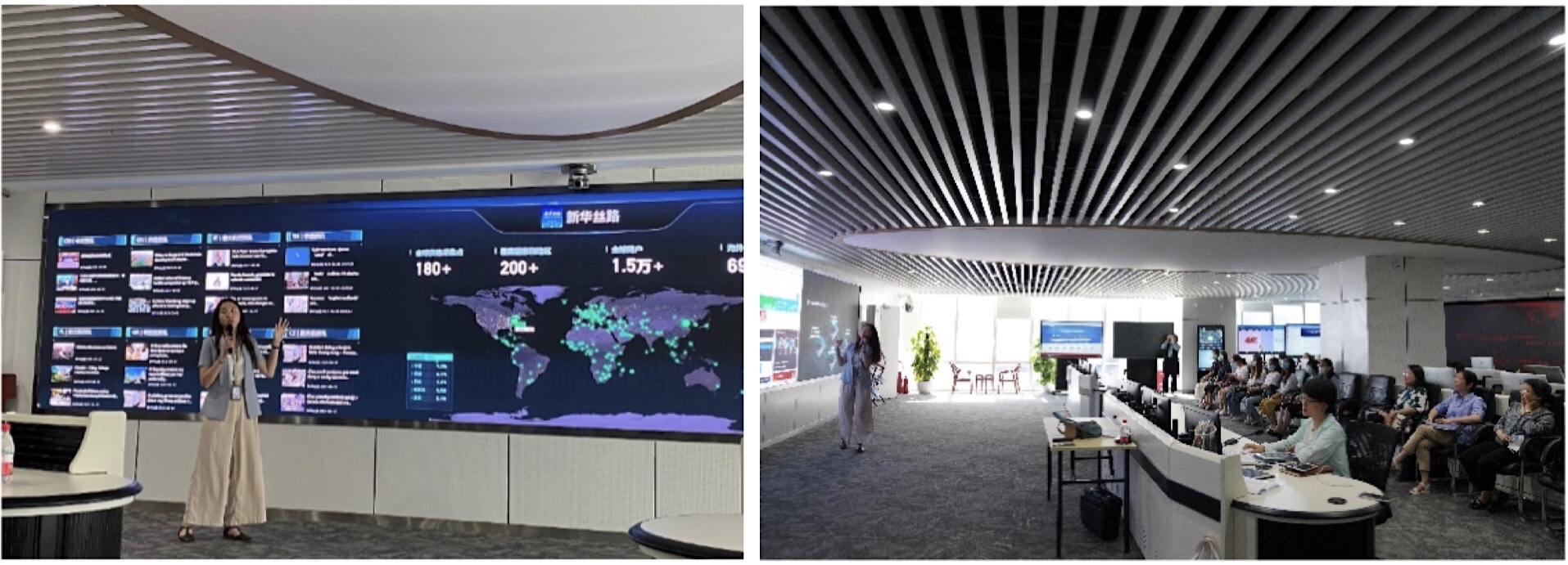 之后,大家一起前往新华社三工作区参观中经社运营指挥中心,李诗萌,同时也是我院英语口译专业2020级毕业生,为大家细致讲解了新华丝路“一带一路”国家级信息服务平台的运作模式,并用详实的资料展示了新华丝路的业务体系和系列成果。