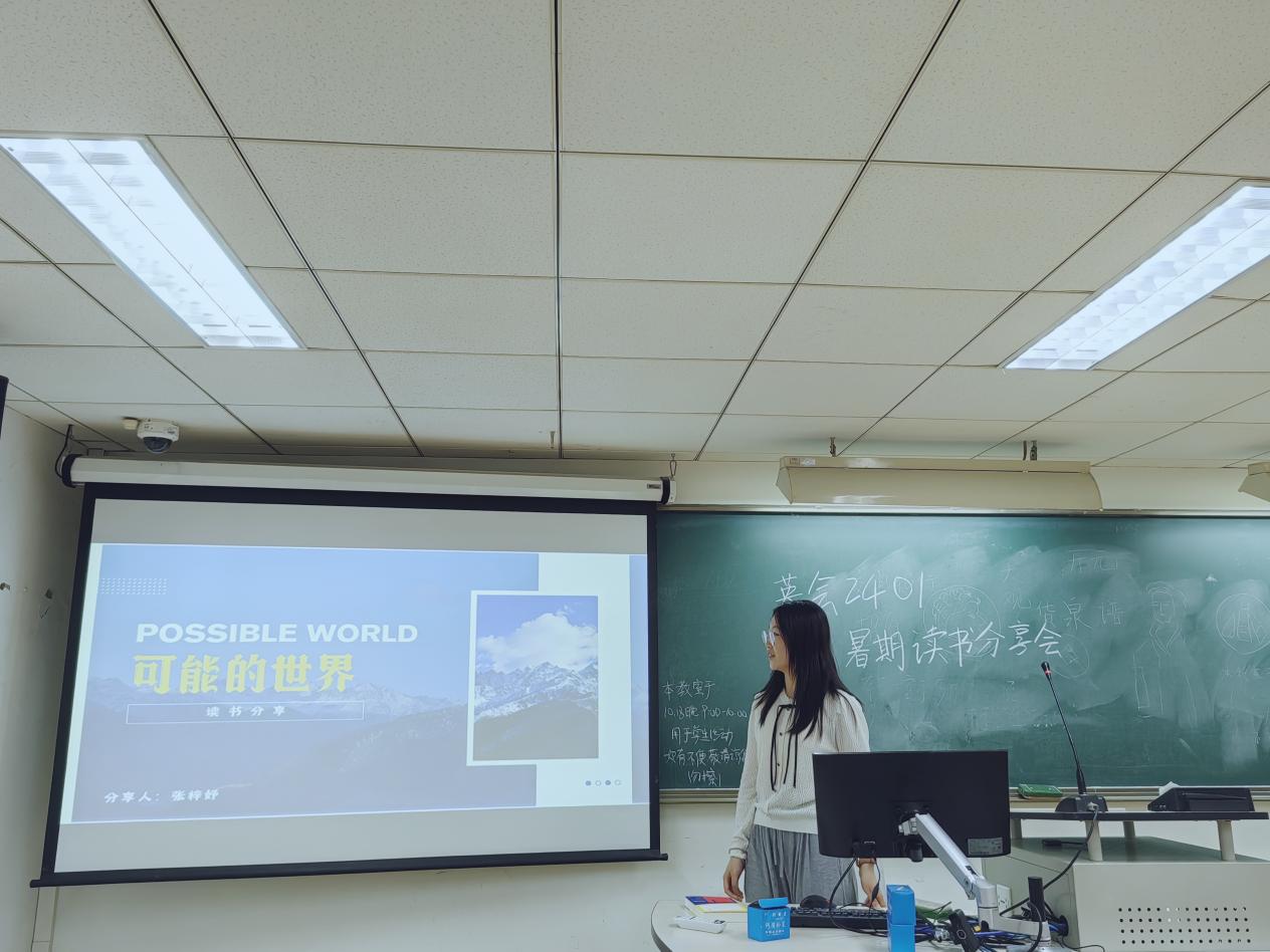 2024年10月18日晚上九点,英会2401班在宁远楼532教室开展了党员新生教育之读书分享会。本次活动共吸引了18位同学参与,由韩娜同学、马千惠同学和张梓妤同学分享《会飞的村庄》、《可能的世界》两本经典著作。