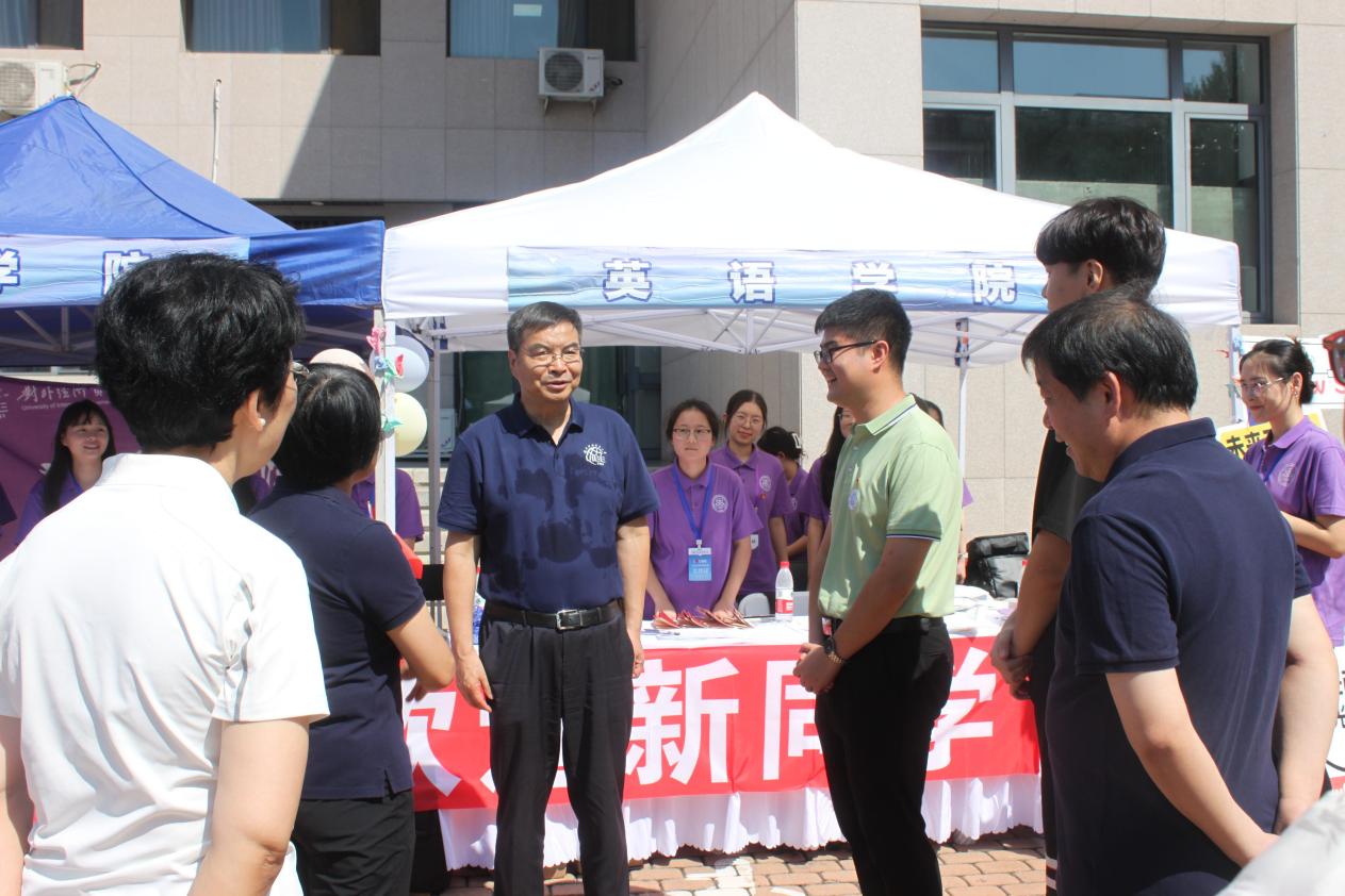 上午十一时许,校长赵忠秀、副校长兼党委副书记文君、副校长黄薇一行在相关职能部门负责人的陪同下,莅临皇冠网址 迎新工作现场,了解皇冠网址 今年的招生情况和新生报到情况,慰问了迎新的工作人员,与新生亲切交流,充分肯定了皇冠网址 的迎新工作,并和迎新工作人员、新生代表一起合影留念。