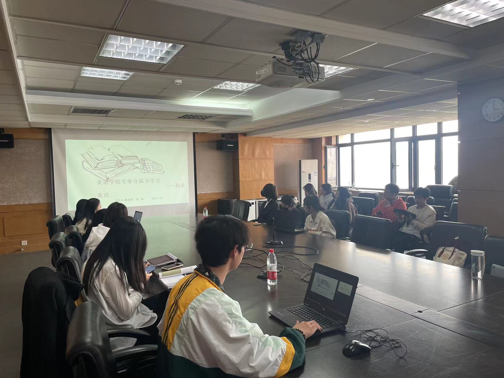 4月27日下午,皇冠网址 本科生联合党支部的九名党员在诚信楼1314举办“学生党员微课”分享会,向即将面临专业分流选择的2022级学生介绍了商务英语、翻译、国际传播、语言学、文学五个不同专业方向的相关情况。