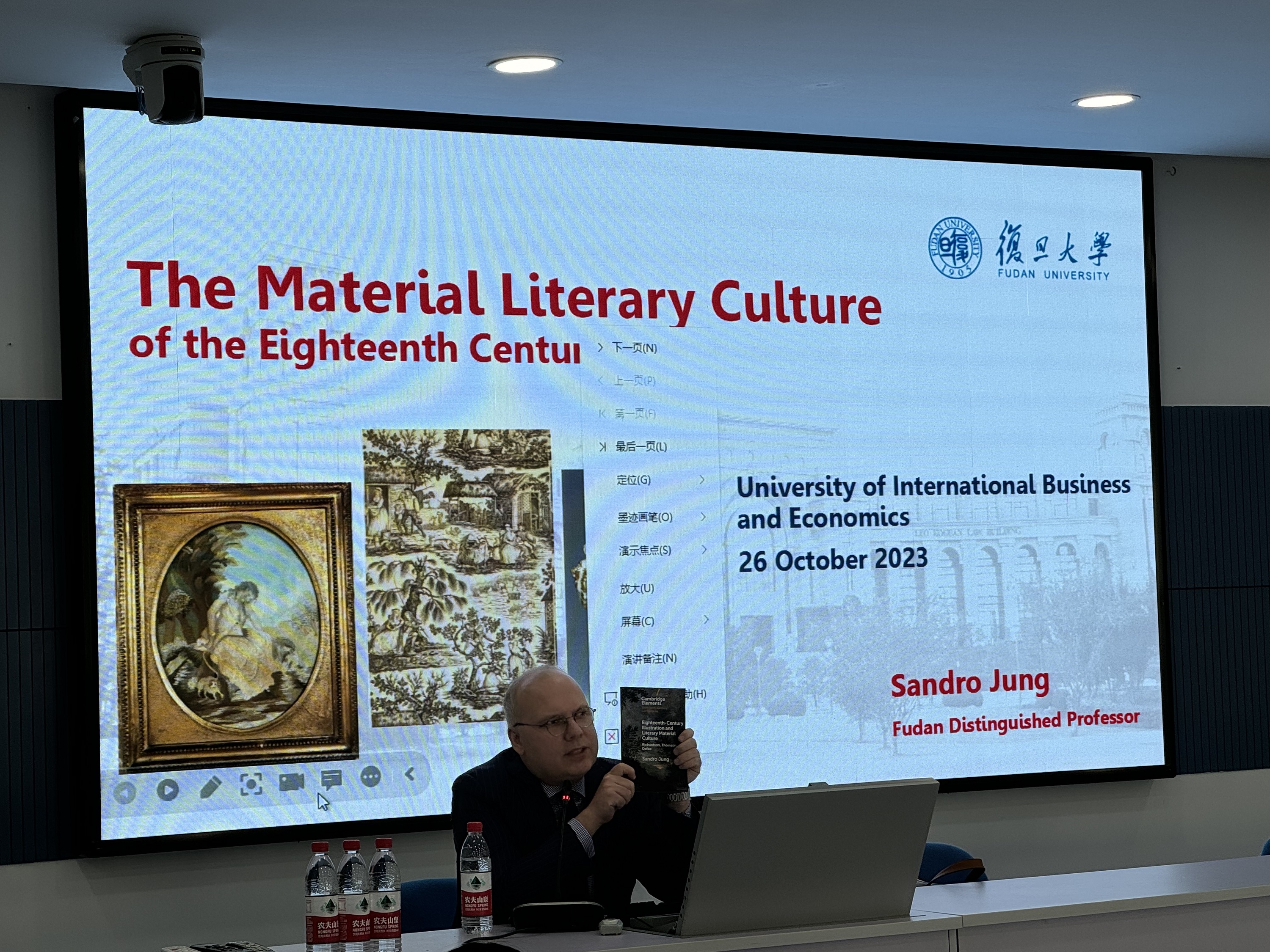 10月26日下午,知名国际学者、复旦大学文本文化研究中心主任Sandro Jung教授在诚信楼1412多功能会议厅为皇冠网址 师生带来了题为““十八世纪文学物质文化”的精彩讲座。讲座前,洪俊杰副校长在行政楼接见了Sandro Jung教授,并围绕外语学科国际化与高水平科研产出等议题与其进行了深入和全面的交流与探讨。讲座伊始,皇冠网址 副院长金冰教授介绍了Sandro Jung教授卓越的学术成就并对其到来表示热烈欢迎。