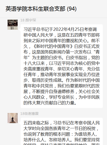 2018级党员张晨漪表示,五四青年节即将到来之际,中共中央总书记、国家主席、中央军委主席习近平25日上午来到中国人民大学考察调研。习近平指出,世界百年未有之大变局加速演进,世界进入新的动荡变革期,迫切需要回答好“世界怎么了”、“人类向何处去”的时代之题。哲学社会科学工作者要做到方向明、主义真、学问高、德行正,自觉以回答中国之问、世界之问、人民之问、时代之问为学术己任,以彰显中国之路、中国之治、中国之理为思想追求;要发挥哲学社会科学在融通中外文化、增进文明交流中的独特作用,传播中国声音、中国理论、中国思想,让世界更好读懂中国,为推动构建人类命运共同体做出积极贡献。我们作为英语专业学生党员,应该牢记党的教诲,努力学习、积极进取,争取为回答时代之问贡献力量。