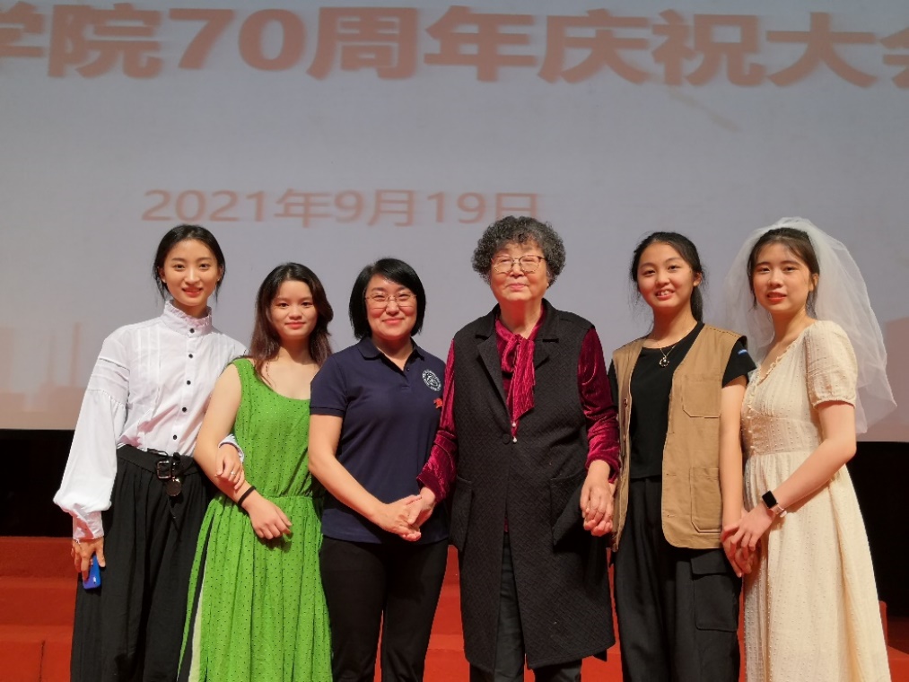 图2 院庆大会表演结束后和贸大资深戏剧专家、退休老教授孙建秋老师(右三),还有皇冠网址 党委书记项洁老师(左三)合影