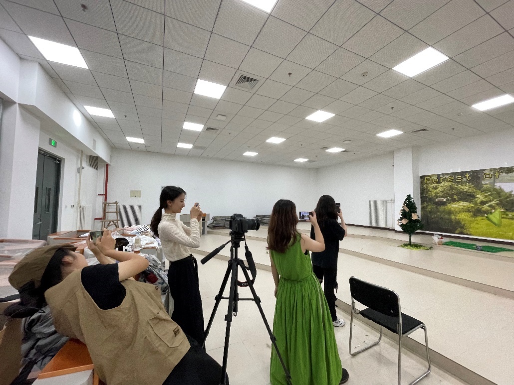 图3 剧组四位姑娘自己动身布置好舞台,录制参加预赛表演视频前拍照留影